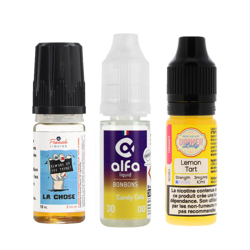 A&L vous propose de débuter la vape tout en simplicité grâce à ce pack de 3 e-liquides comprenant : Le Lemon Tart, La Chose et le Candy Fraise, conçu par Dinner Lady, Le French Liquide et Alfaliquid.