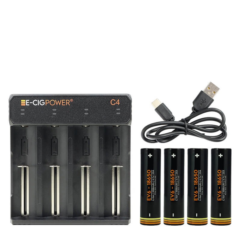 Here is a complete recharging pack that has both the C4 LED 4-spaces charger by E-Cig Power and 4 EV6 18650 batteries by E-Cig Power!