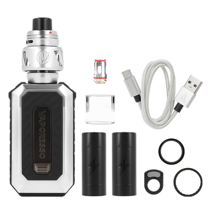 Pour alimenter ce kit de 220W, Vaporesso l'a doté d'un système d'alimentation en double accu 21700 (non fournis). Vous trouverez la trappe à accus sous votre kit, s'ouvrant facilement et rapidement grâce au bouton de déverrouillage situé sur le côté opposé à la façade principale.