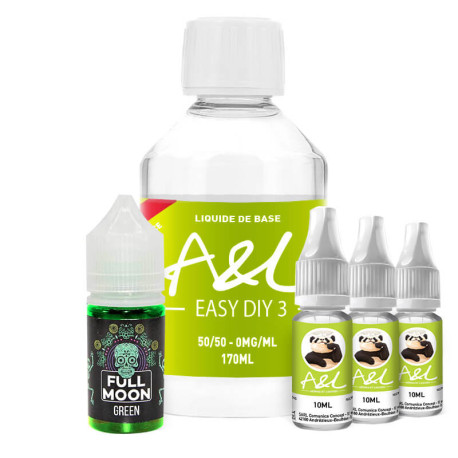 Grâce au pack DIY Green Full Moon 200ml proposé par Arômes et Liquides (A&L), créez rapidement et simplement un gros volume de e-liquide à vapoter. Tout est compris dans ce pack ! Vous n'aurez aucun calcul à faire, seulement à sélectionner le taux de nicotine souhaité, à patienter, puis à mélanger les divers ingrédients reçus !