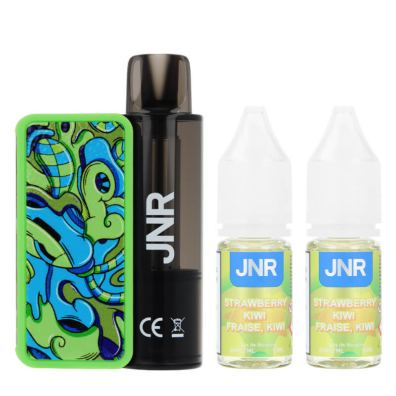 Dans votre kit, JNR vous glisse deux flacons 10 ml de e-liquides Strawberry Kiwi, au goût de la fraise et du kiwi.