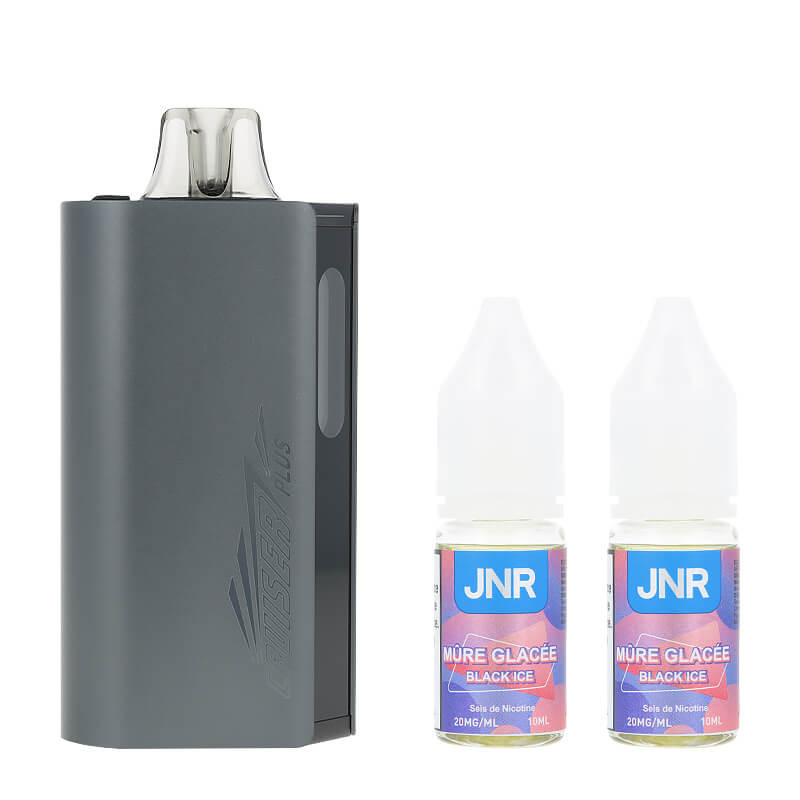 Avec votre puff, vous recevez également deux flacons JNR 10ml Black Ice en sels de nicotine (20mg/ml), à la saveur d'une mûre glacée.